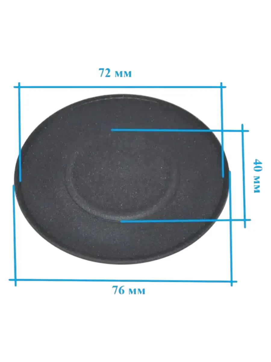 Крышка горелки средней мощности Покрытие: эмаль Диаметр: 76 мм Диаметр малой части корпуса на внутренней стороне крышки: 40 мм Толщина примерно: 4 ммСовместимость