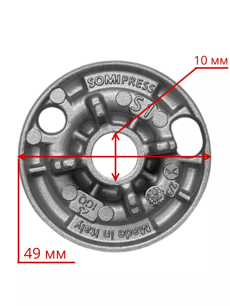 Рассекатель (смеситель) малый газовой плиты HANSA Рассекатель малый газовой плиты 8037913 рассекатель 49 мм пламени конфорки малой мощности для плиты Hansa Газогорелочная группа Somipress Тип: рассекатель горелки Назначение: для газовой плиты Материал: металл Цвет: металлик Диаметр: 49 мм Высота: 23 мм Внутренний диаметр отверстия: 10 мм Диаметр ножки: 16 мм Конфорка позволяет обеспечить подачу газа для нагревания поверхности. Горелка состоит из нескольких важных деталей, благодаря которым оборудование работает эффективно. Смеситель для кухни позволяет равномерно распределить объем пламени по всему периметру. Комфорка позволяет избежать распыления газа, концентрирует тепло. Рассекатель для газовой плиты имеет специальные отверстия, количество которых зависит от диагонали поверхности. Необходимо обращать внимание на данный параметр, так как он влияет на интенсивность пламени, которое может быть мощным или слабым. Конфорка довольно простое приспособление, но и при ее эксплуатации следует соблюдать некоторые меры безопасности. Перед началом работы новый рассекатель рекомендуется прокалить на огне, чтобы удалить заводскую смазку. Саму установку требуется производить при выключенной конфорке. Иначе есть большой риск получить ожог. Для продления срока службы стоит использовать среднее или малое пламя, и только в редких случаях работать на максимуме. Также необходимо регулярно мыть смеситель горелки, потому что остатки пищи и жира при большой температуре повредят его верхнее покрытие. Чтобы помыть рассекатель газовой горелки, его нужно снять и замочить в теплой воде с моющим средством на 30–50 минут. После этого почистить абразивной губкой, а отверстия проколоть иголкой или проволокой. В то же время, если постоянно поддерживать чистоту плиты, то такие сложные манипуляции не понадобятся. Просто мойте плитку и рассекатель чаще! При замене данной запчасти для плиты есть две основные рекомендации.Совместимость