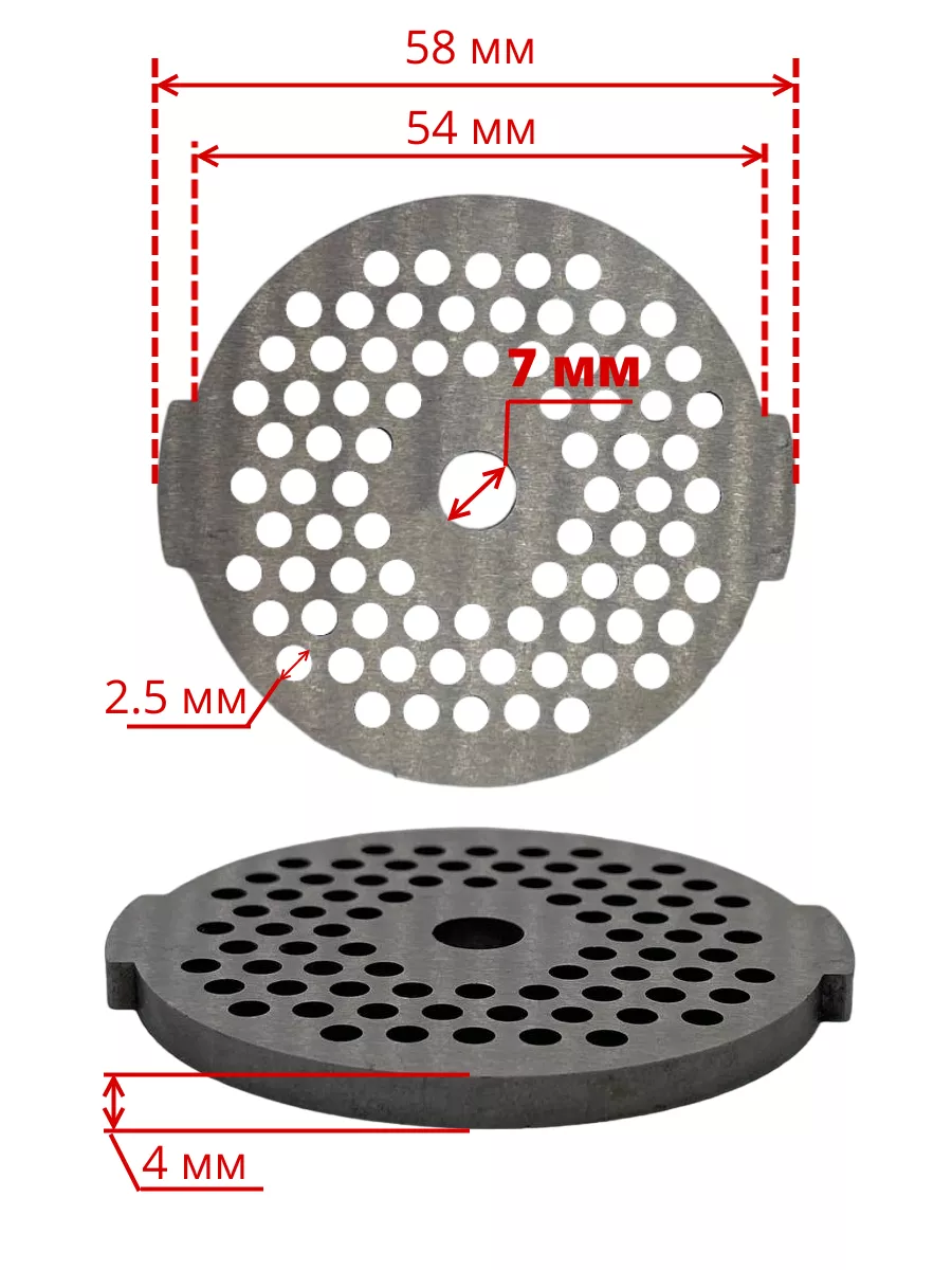 Решетка средняя для мясорубки Диаметр по ушкам: 58 мм. Диаметр решётки без ушек: 54 мм. Диаметр посадки: 7мм. Диаметр отверстий: 2,5мм. Толщина: 4 ммСовместимость