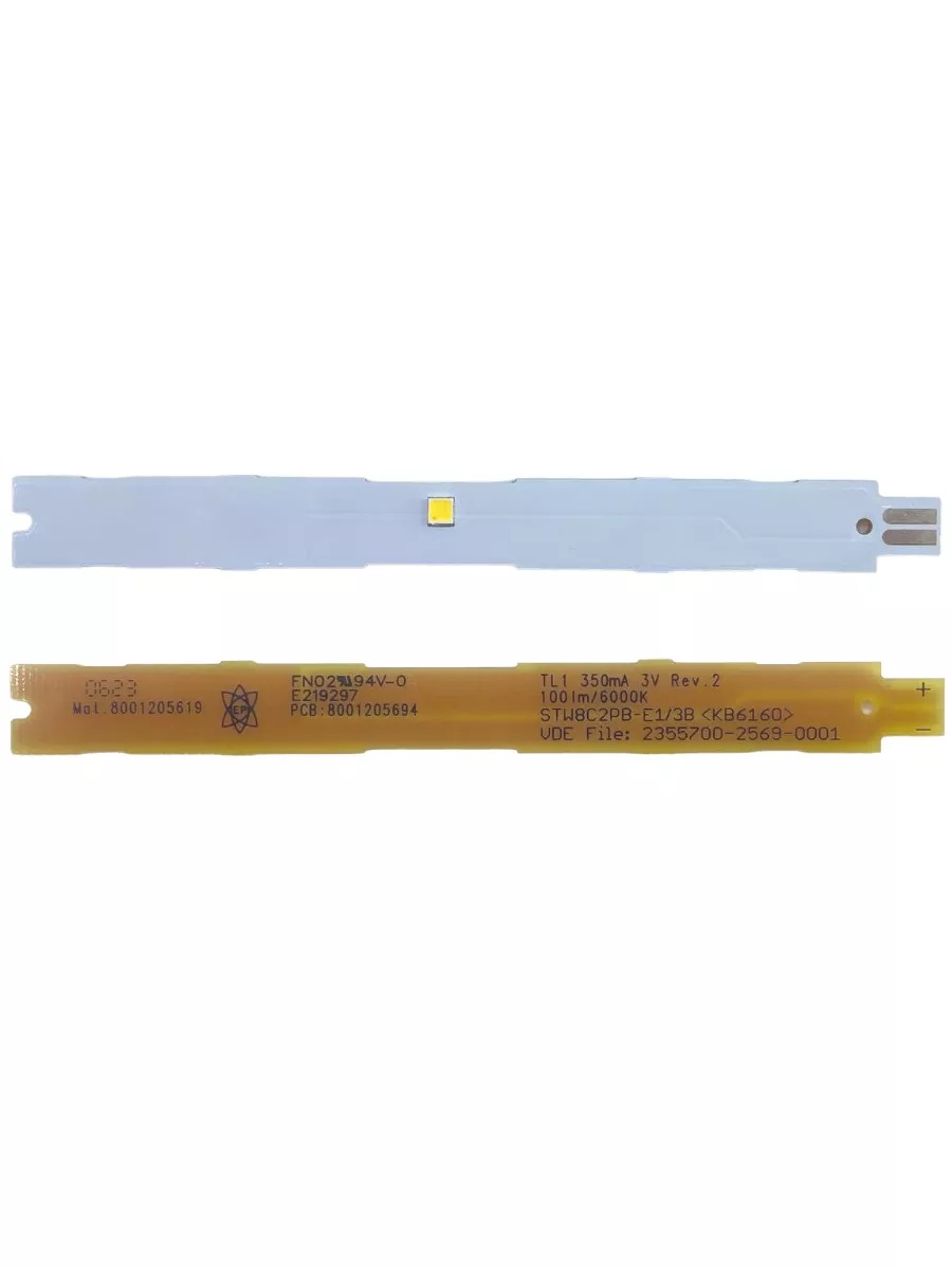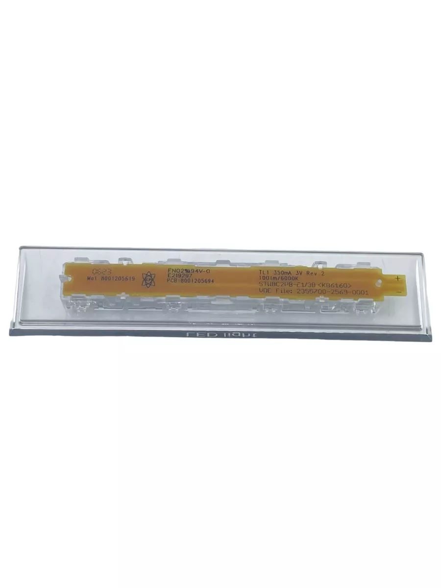 Лампа в сборе для холодильника BOSCH, Siemens - светодиодная. Лампочка в сборе с корпусом Технические характеристики: Размеры корпуса: Длина - 137 мм Ширина - 32 мм Высота - 3-7 мм Размеры платы: Длина - 110 мм Ширина - 11 мм Высота - 2 мм Надписи на плате: 0623 Mat. 8001205619 FNO25U94V-0 E219297 PCB: 8001205694 TL1 350mA 3 V Rev. 2 100lm/6000k STW8CPB-E1/3B VDE File: 2355700-2569-0001Совместимость