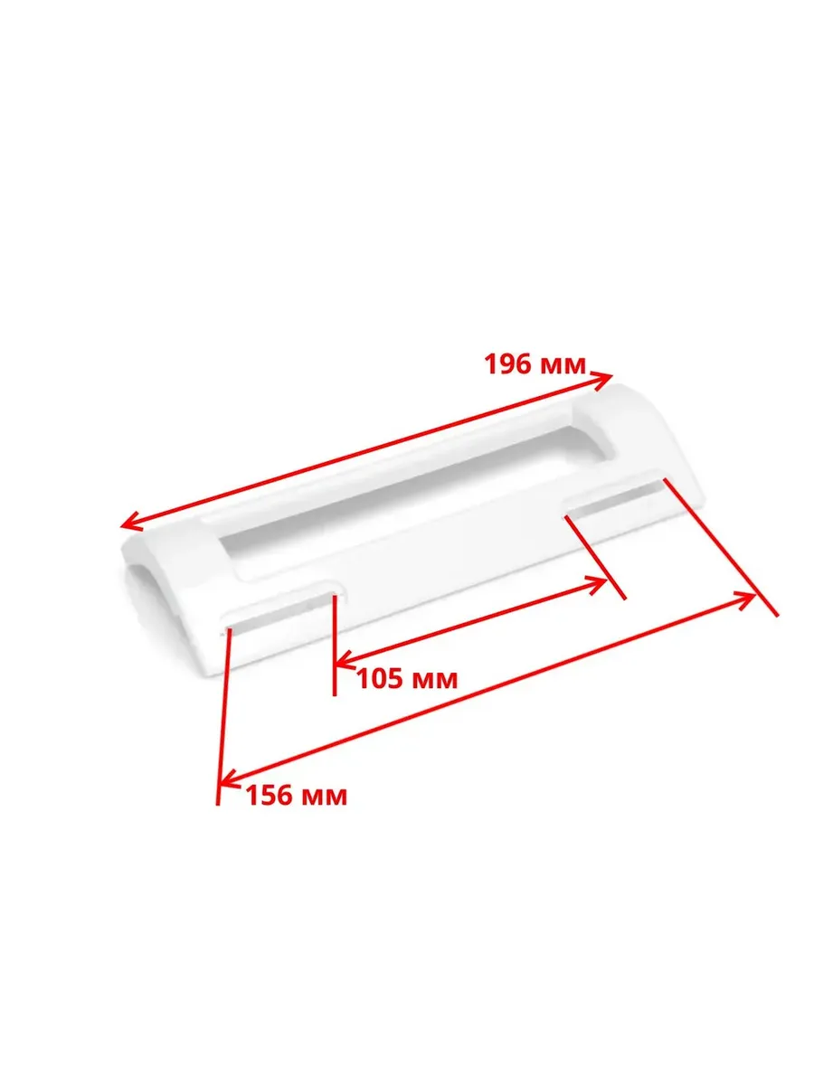 Ручка холодильника универсальная Длина - 196 мм Расстояние между крепёжными болтами от 105 мм до 156 мм Цвет - белый Материал - пластик В комплекте 2 заглушки и 2 винта для установкиСовместимость